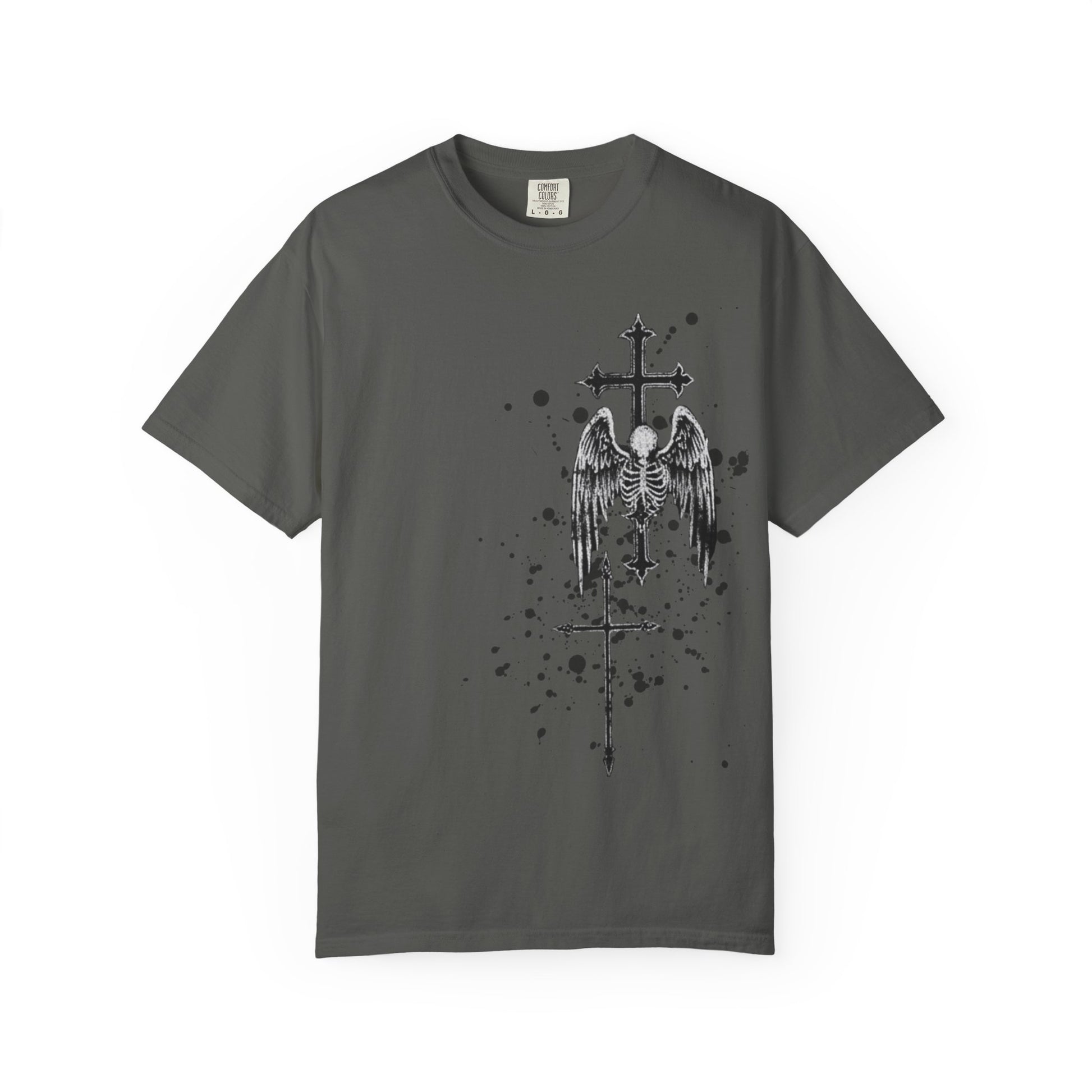A dark, hand-drawn streetwear tee that feels like a midnight sketch brought to life. The monochrome ink illustration — a striking cross flanked by an angel — carries grit and quiet reverence. High-contrast lines and grunge textures give the shirt a raw, lived-in look that layers easily under a leather jacket or stands bold on its own. Wear it to late-night shows, city walks, or when you want an edge that reads artful rather than loud.