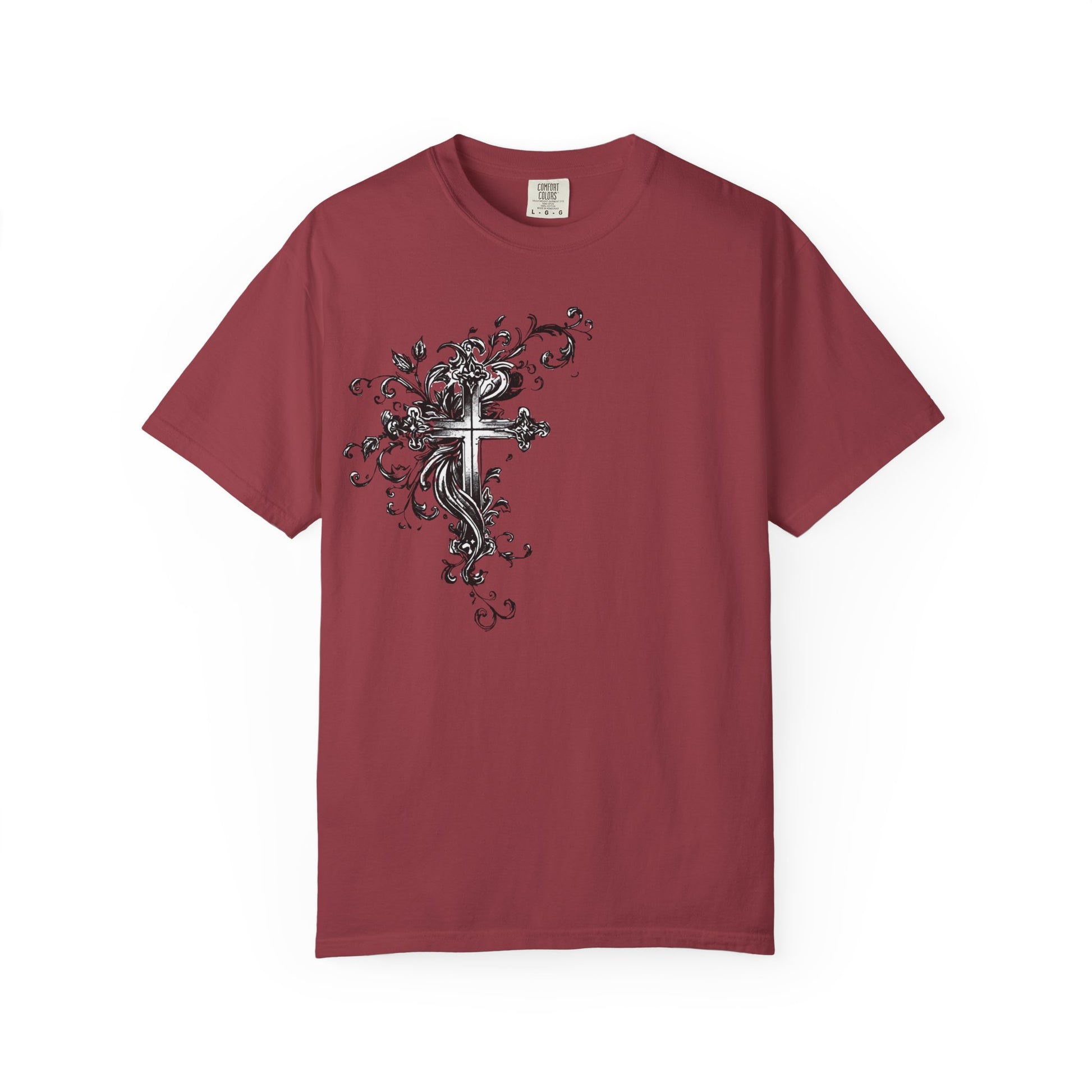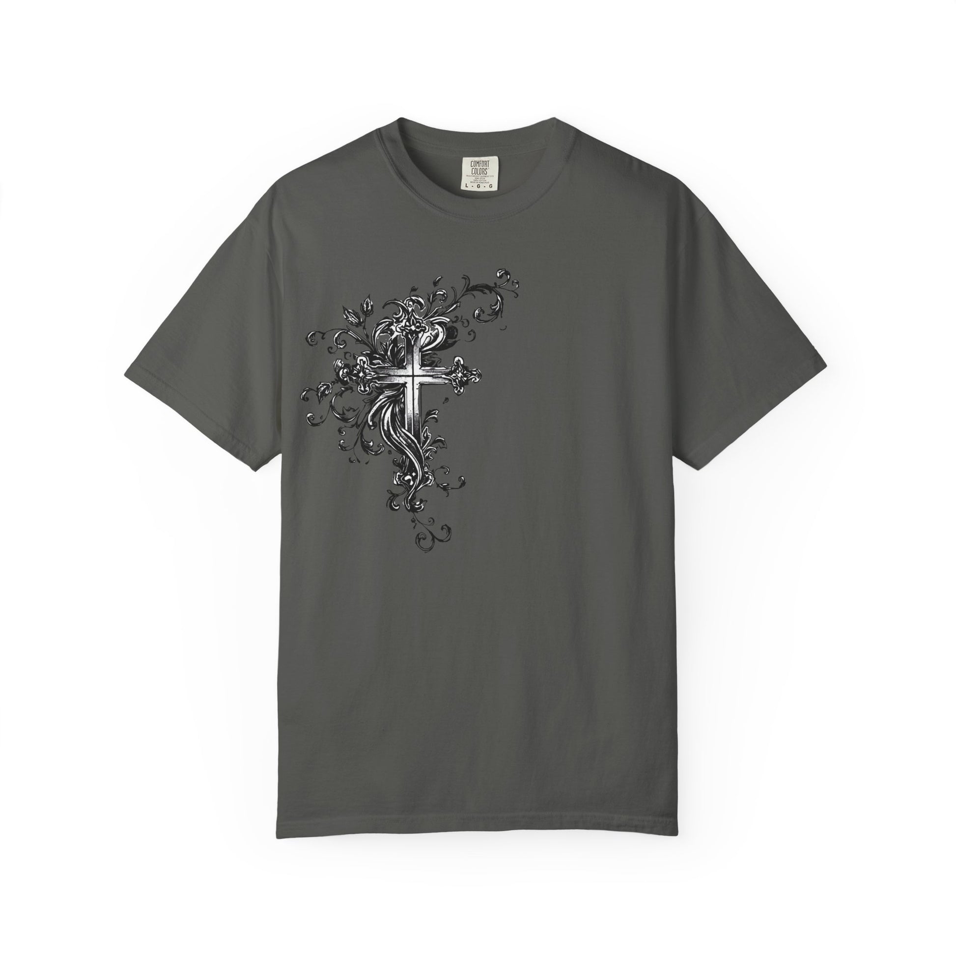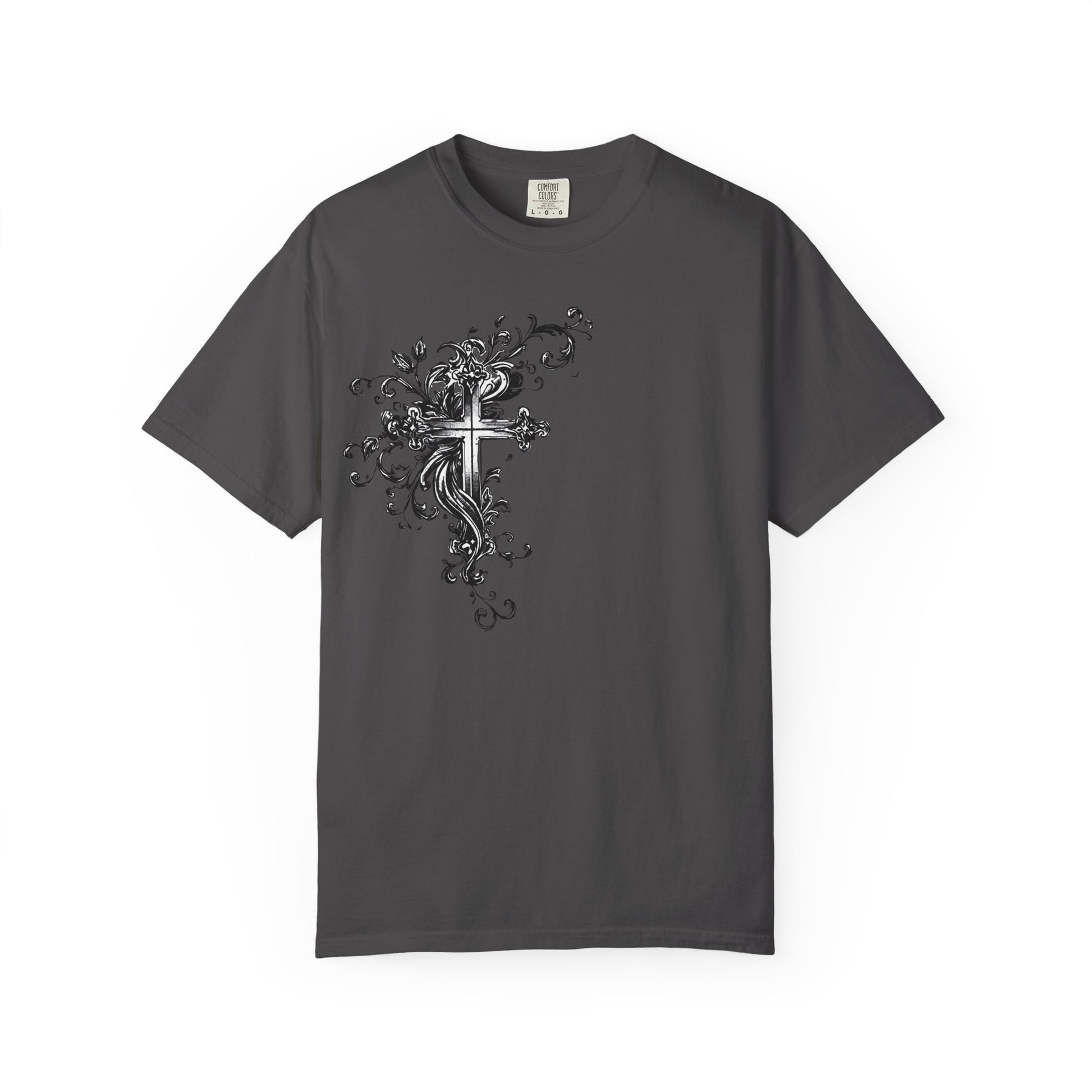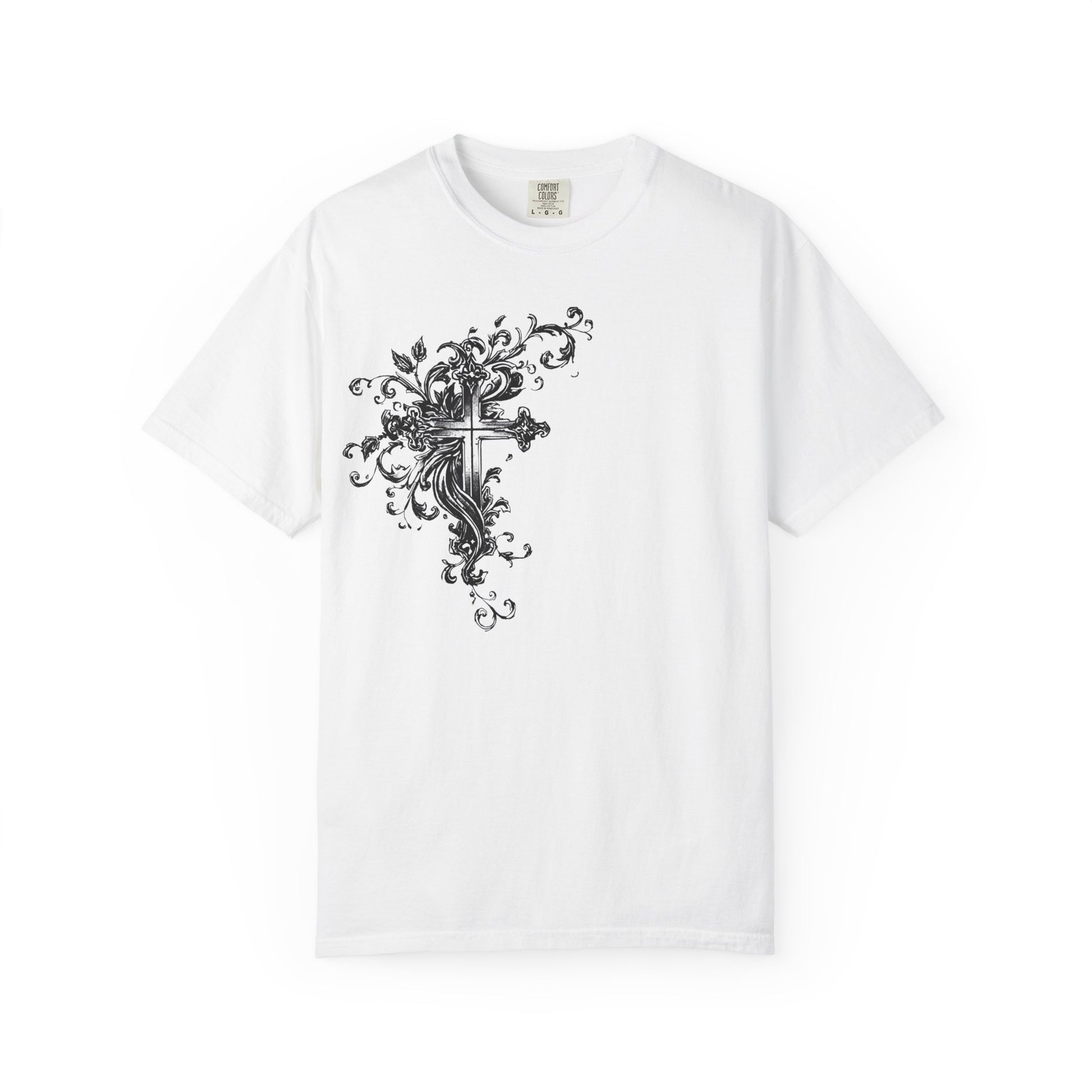 A dark, hand-drawn streetwear tee that feels like a midnight sketch brought to life. The monochrome ink illustration — a striking cross flanked by an angel — carries grit and quiet reverence. High-contrast lines and grunge textures give the shirt a raw, lived-in look that layers easily under a leather jacket or stands bold on its own. Wear it to late-night shows, city walks, or when you want an edge that reads artful rather than loud.