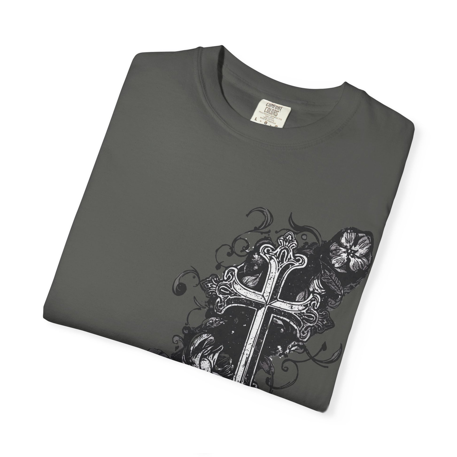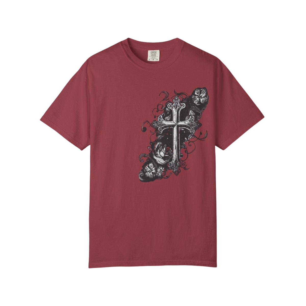 A dark, hand-drawn streetwear tee that feels like a midnight sketch brought to life. The monochrome ink illustration — a striking cross flanked by an angel — carries grit and quiet reverence. High-contrast lines and grunge textures give the shirt a raw, lived-in look that layers easily under a leather jacket or stands bold on its own. Wear it to late-night shows, city walks, or when you want an edge that reads artful rather than loud.